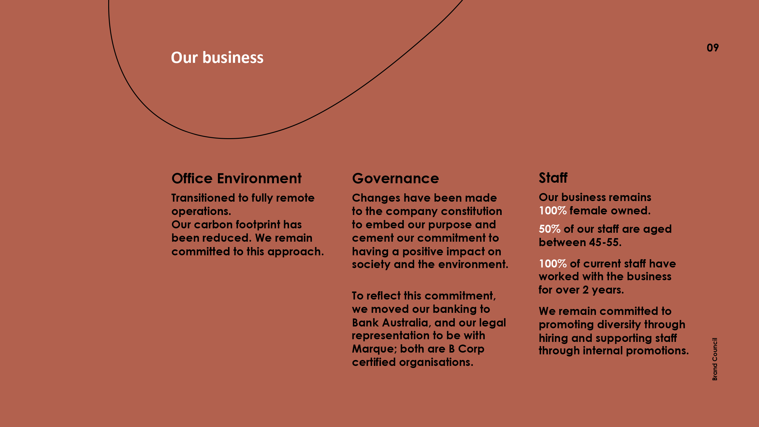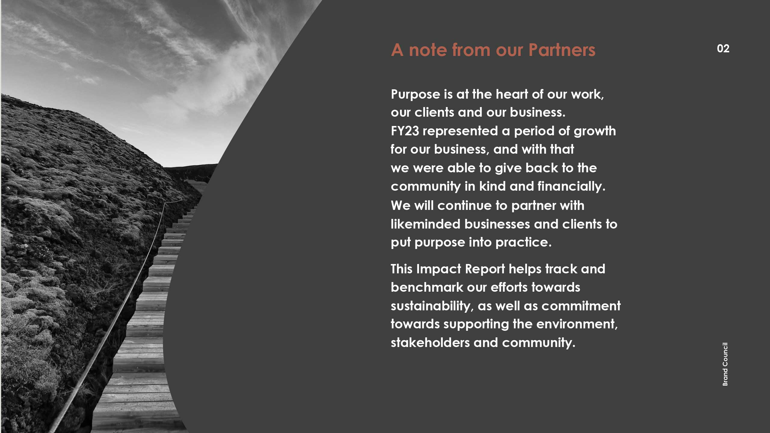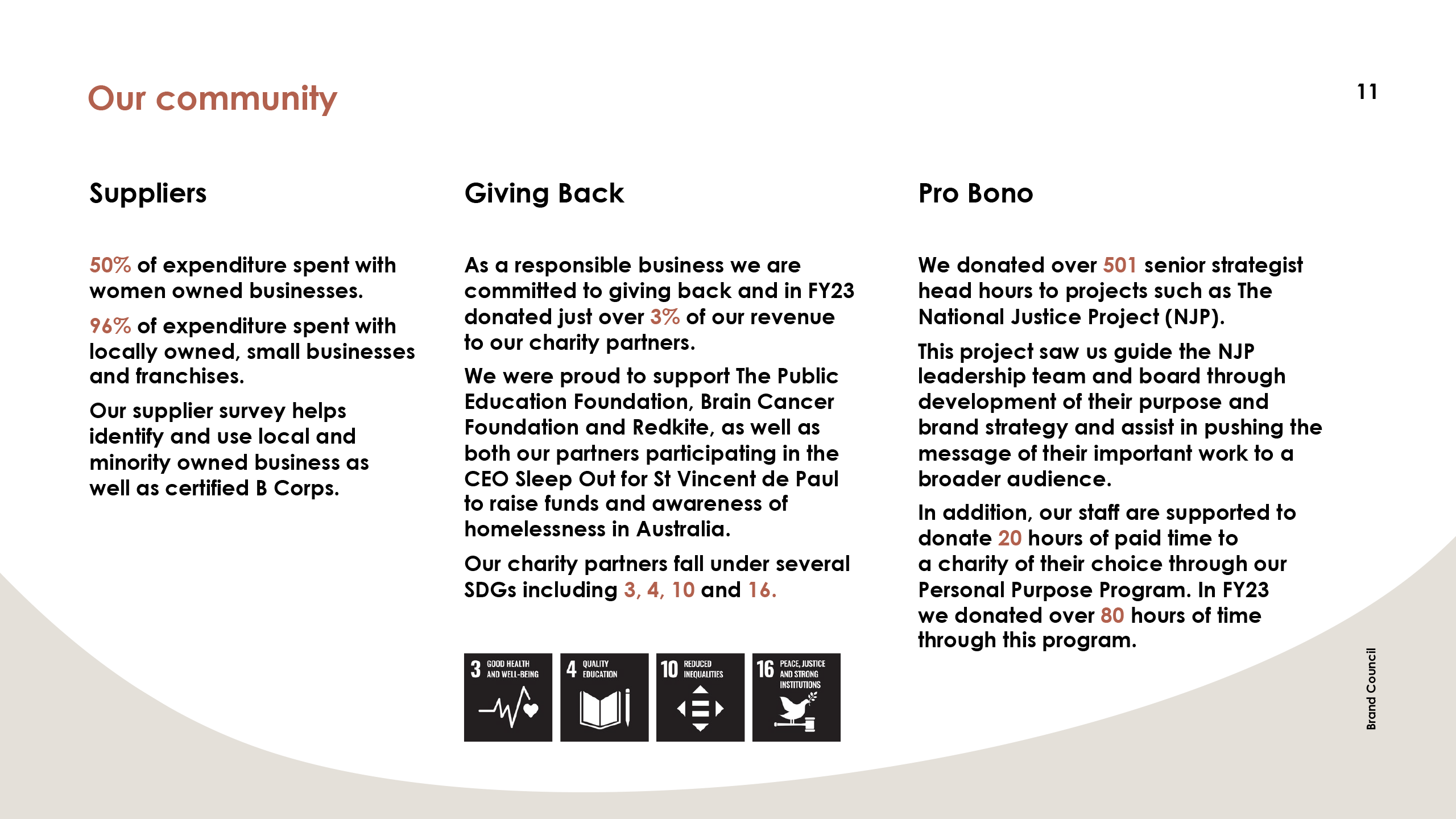 Over the last 18 years Brand Council has been dedicated to ensuring our work is impact focussed. Our leading role in purpose transformation, helping to guide companies through culture change, and our commitment to supporting NFP has been rewarding.